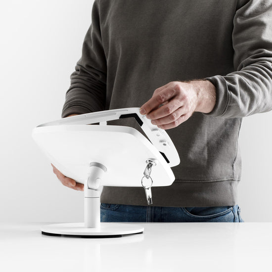 With integrated tilt, flip and rotation, it allows for flexible screen positioning, perfect for sharing content or adjusting the angle for comfort. Its low-profile design makes it an ideal choice for busy retail counters, check-in stations and reception areas where space is at a premium.