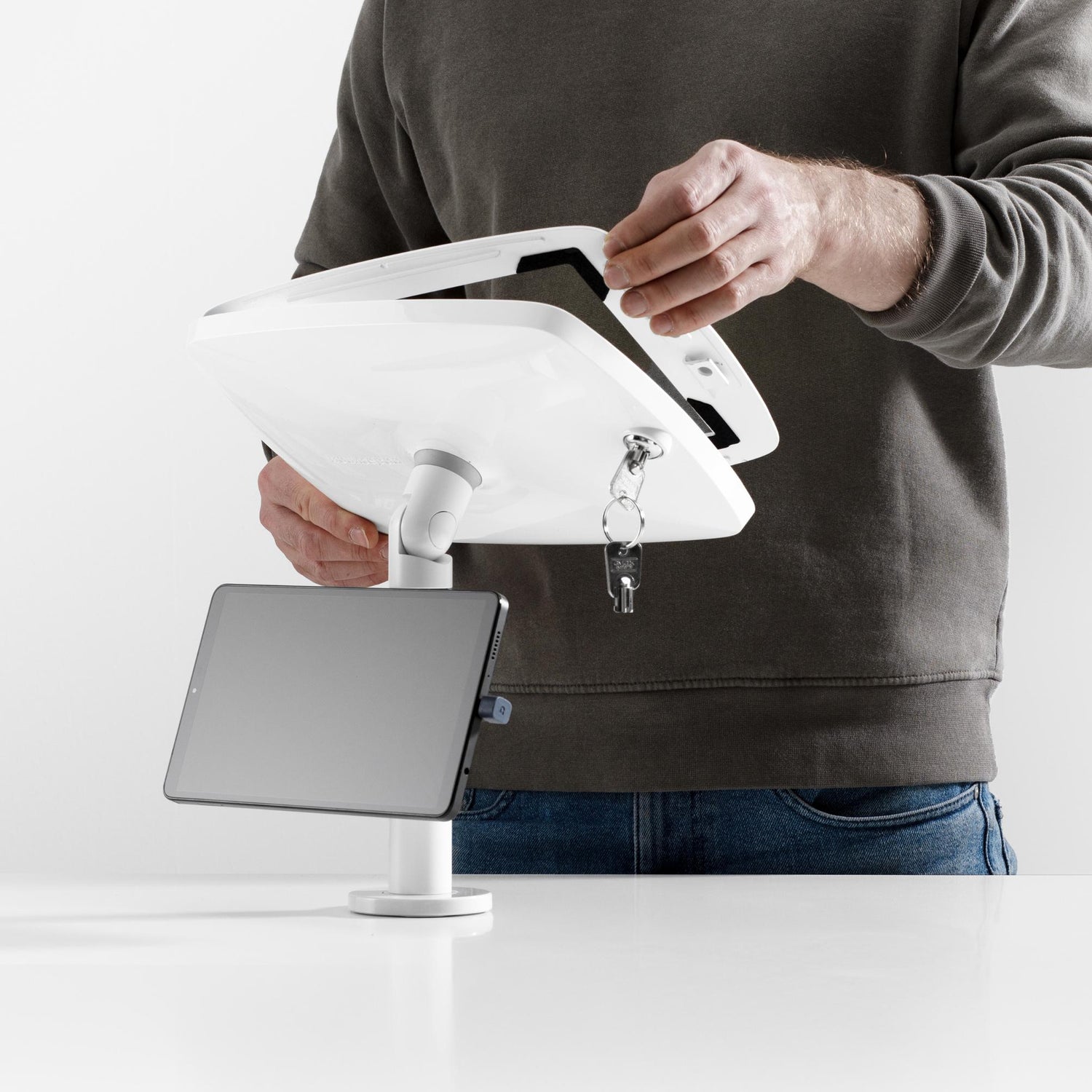 The primary tablet is secured with our lockable Original Range enclosure, while the secondary tablet is held firmly in place with the strong adhesive mount from our Core Range. Power cables are hidden and routed for a professional look. Bulk orders come with a universal key set, so you’ll never need to worry about mismatched locks.