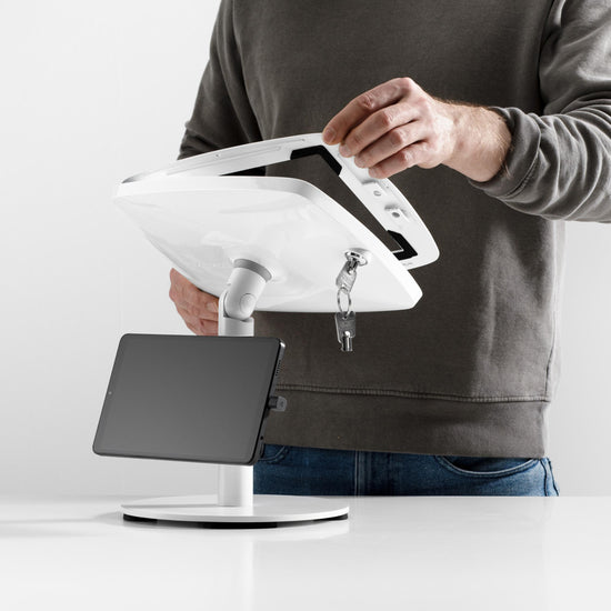 The primary tablet is secured with our lockable Original Range enclosure, while the secondary tablet is held firmly in place with the strong adhesive mount from our Core Range. Cables are neatly concealed and routed for a professional look. With bulk orders, you'll receive a universal key set to keep things simple.