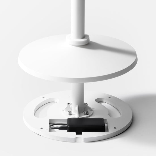 The heavy solid steel base ensures stability, perfect when mounting to the floor is not an option. You can also conceal a power adaptor or battery pack under the magnetic cover (can be mounted to the floor if preferred).
