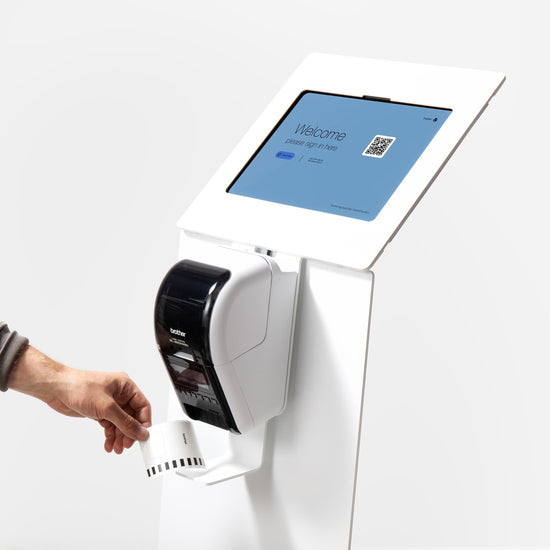 The Wing + Brother Printer Mount is a premium, full-metal iPad floor stand from Bouncepad that combines bold design, robust security, and integrated power management with a dedicated mount for Brother label printers. Perfect for self-check-in, ticketing, and retail environments, it provides a clean, professional setup that keeps all hardware secure, powered, and ready for use.