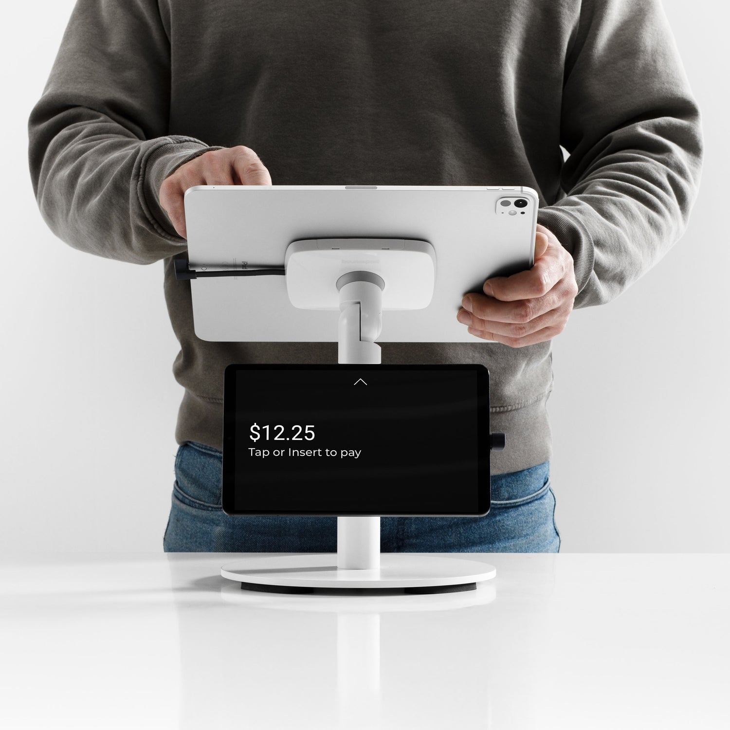 Engineered for seamless interaction, the main screen features tilt and rotate adjustment, so staff can position it exactly where they need it. The secondary, customer-facing tablet displays pricing and purchase details, creating a smooth and engaging checkout experience.